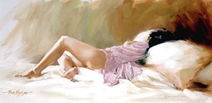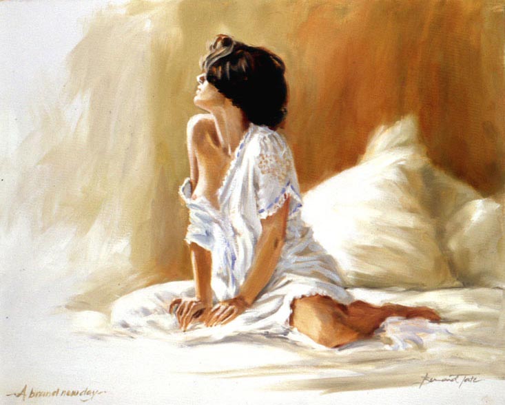 "Bernard Tate announces that he works in the "romantic" tradition. Yet we will not find among his paintings the exoticism, the pomp, the allegorical layers that characterize nineteenth-century romanticism. If anything, we may see in his paintings a hint of Degas, but softened into a sense of wonder and respect for the female; for the girl. Bernard Tate's pictures celebrate the beauty of feminine youth and the miracle of every day. "A Brand New Day" inaugurates the awakening of this new romanticism. The young girl, still protected by the purity of her white nightgown sliding off her shoulder, reveals unwittingly to the viewers the signs of her femininity. Her short brown hair, in its tossled look, emphasizes the burgening sensuality of her little breast.